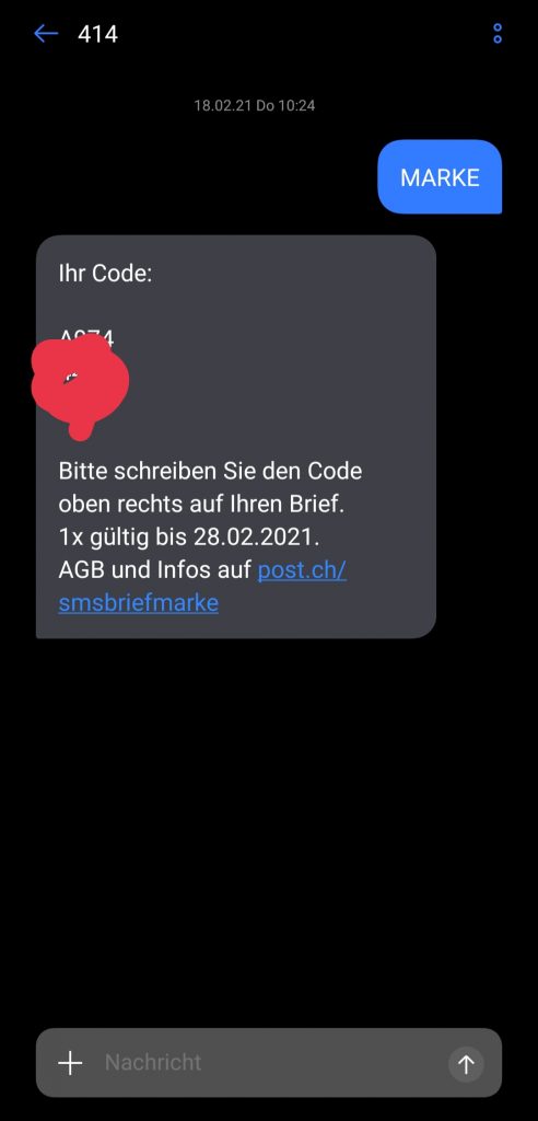 An die Nummer 414 kann man das Wort MARKE schicken und der Code für Briefmarke wird dann zugeschickt