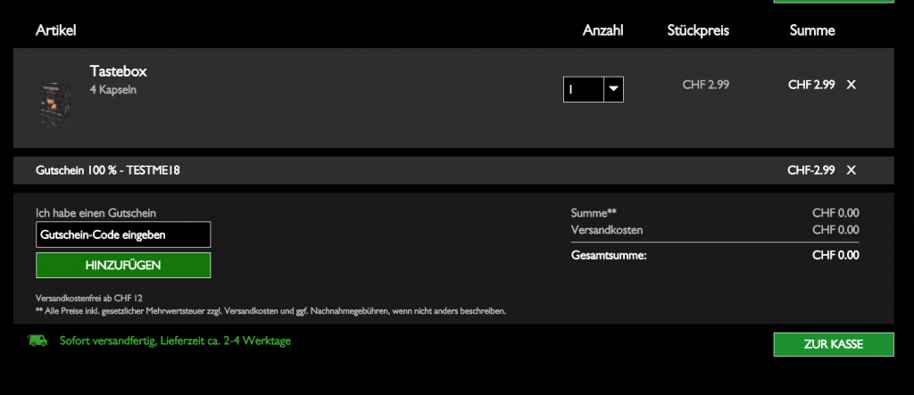 Mit dem Gutscheincode TESTME18 erhält man von Café Royal eine Tastebox gratis. Diese enthält vier Kaffekapseln für das Nespresso-System der Sorten Espresso, Espresso Forte, Lungo und Lungo Forte sowie einen Gutschein mit 30% Rabatt auf die erste Bestellung bei Café Royal.