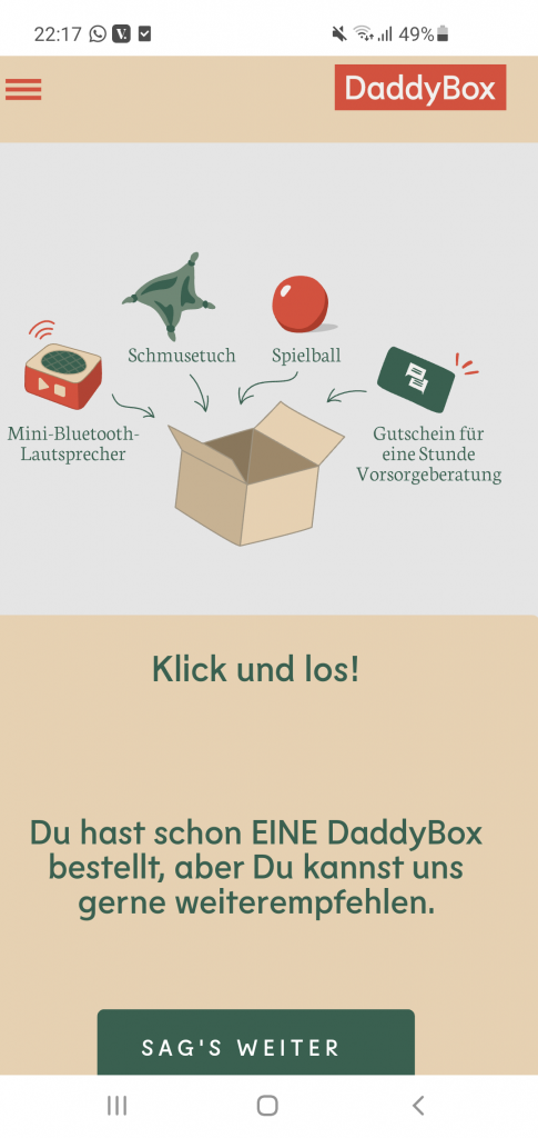Grundsätzlich für Väter gemacht, aber man kann sich auch als Frau anmelden. Bluetoothsprecher, Ball und Kuscheltier waren dabei plus 1h Vorsorgeberatung.