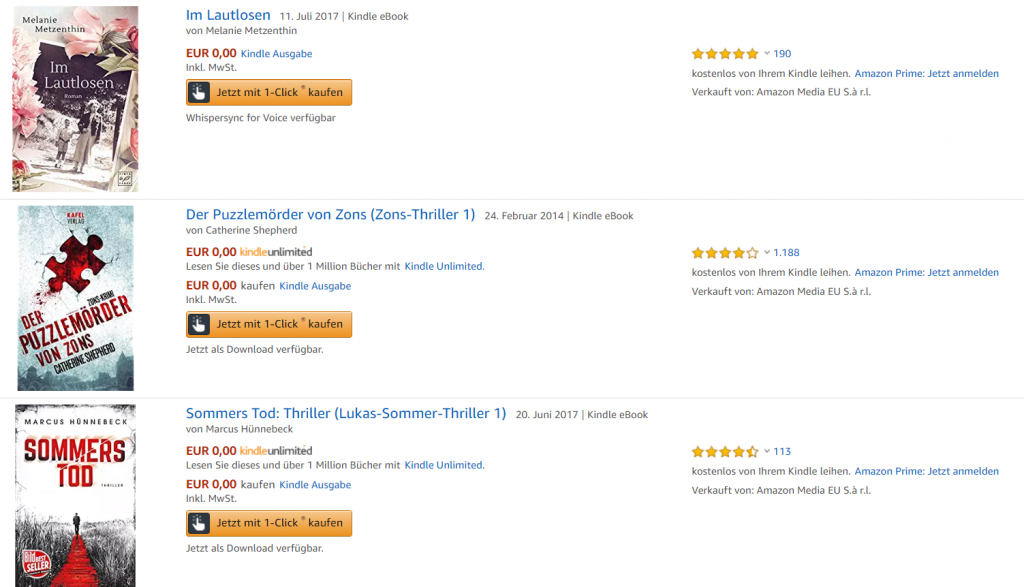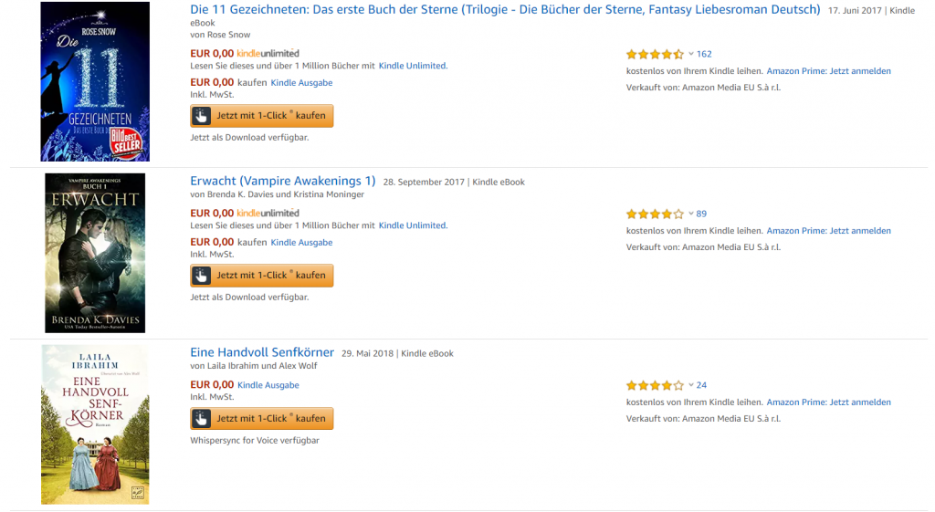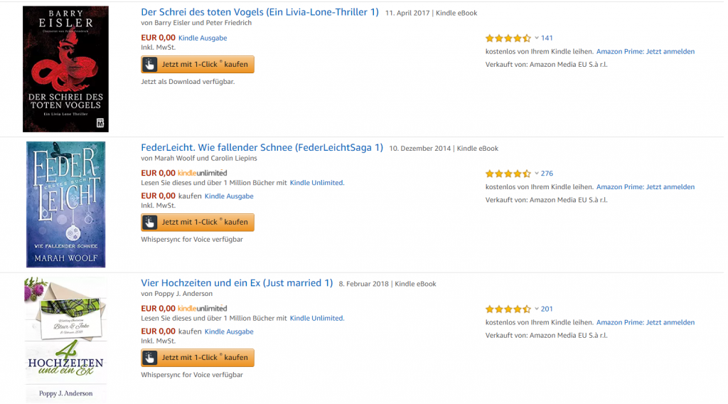 Einen kleinen Haken gibt’s: Zwar sind das alles sehr beliebte Bücher, aber meistens erhält man den ersten Teil einer mehrteiligen Serie gratis (damit man hoffentlich die weiteren Teile dann bestellt..)