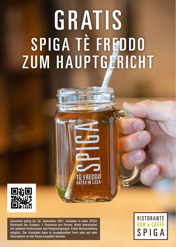 Erhalte jetzt unseren hausgemachten Eistee SPIGA Tè freddo bis zum 30.9.2021 Gratis zum Hauptgericht! Zeige uns den Gutschein auf Deinem Smartphone oder in ausgedruckter Form (PDF-Download) am Counter und gönn Dir den Eistee zu Deiner Pizza, Pasta oder Insalata.