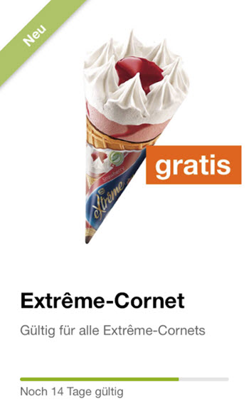 Bei Migrolino kann man sich aktuell ein gratis Extrême-Cornet holen, wenn man die entsprechende App installiert hat (Aktion gilt noch 14 Tage bzw. solange Vorrat).
