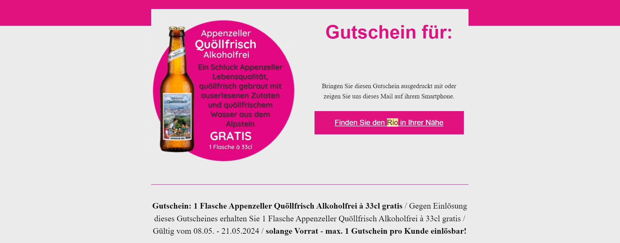 Bei Rio könnt ihr momentan von einem tollen Gutscheinangebot profitieren: Mit einem Gutschein könnt ihr eine 50-cl-Flasche Pepita Grapefruit, eine 50-cl-Flasche Knutwiler PLUS nach Wahl und eine 33-cl-Flasche Appenzeller Quöllfrisch alkoholfrei kostenlos erhalten. Pro Kunde ist der Gutschein einmalig einlösbar. Zeigt einfach den ausgedruckten Gutschein oder den Gutschein auf eurem Smartphone in einer Filiale vor. Dies ist nur in der Filiale erhältlich.