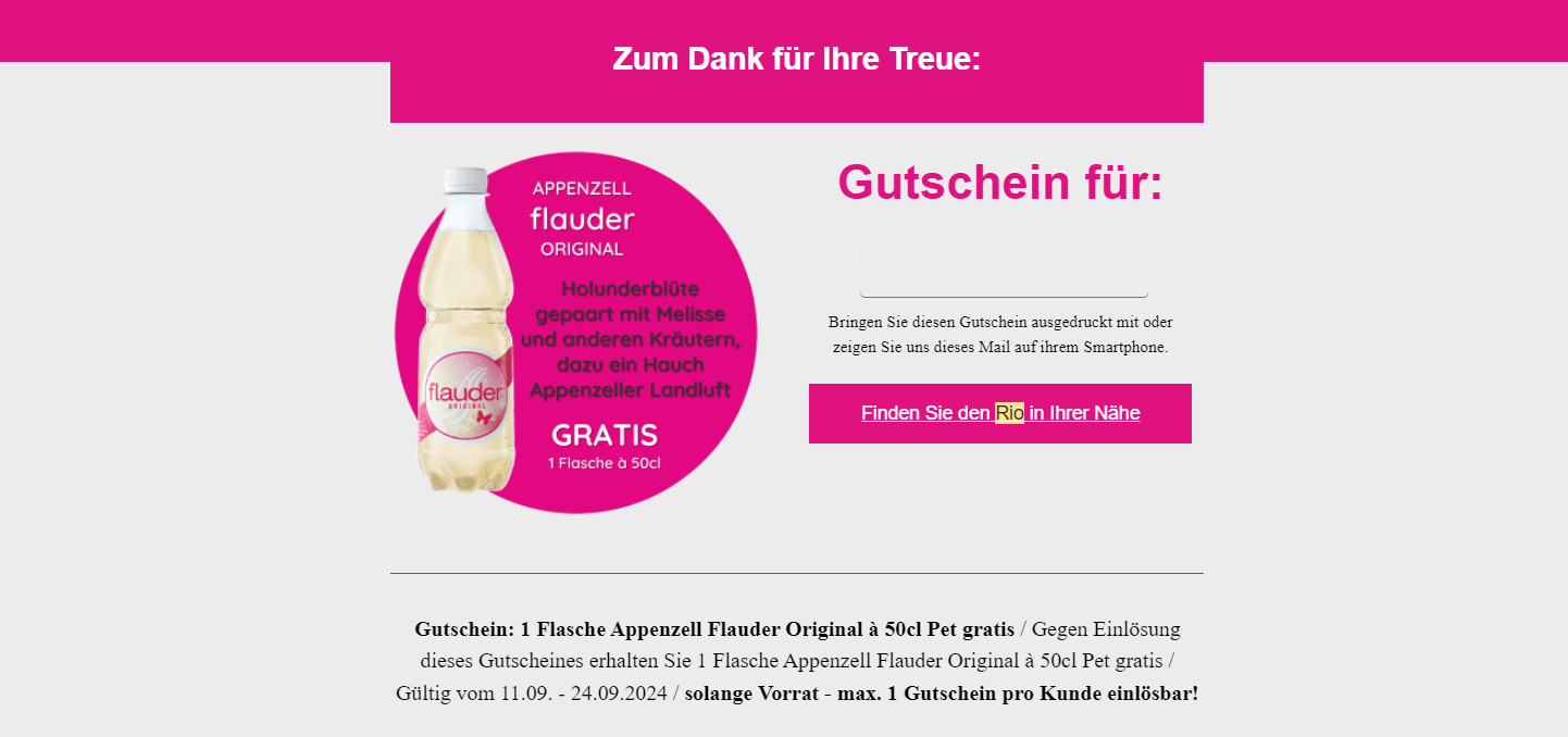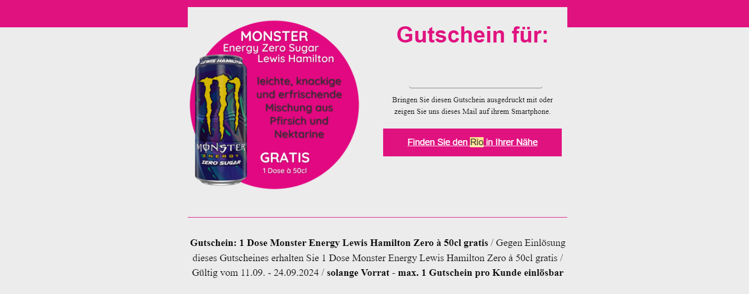 Bei Rio könnt ihr momentan von einem tollen Gratis Getränken profitieren: Mit einem Gutschein erhaltet ihr eine Flasche Appenzell Flauder Original à 50cl PET und eine Dose Monster Energy Lewis Hamilton Zero à 50cl gratis. Pro Kunde ist der Gutschein einmalig einlösbar. Zeigt einfach den ausgedruckten Gutschein oder den Gutschein auf eurem Smartphone in einer Filiale vor. Dieses Angebot ist nur in der Filiale erhältlich.