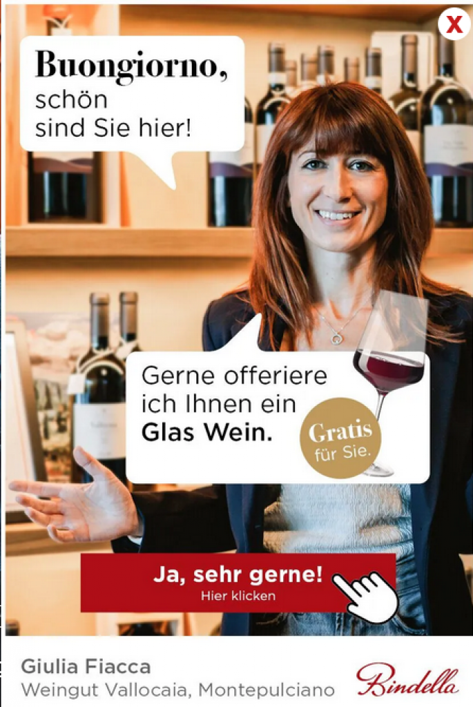 Auf der Website von Bindella erhält man für seine E-Mail-Adresse aktuell einen Gutschein für ein gratis Glas Wein von der Tenuta Vallocaia in Montepulciano. Den Gutschein ehält man als QR-Code per E-Mail zugesandt.