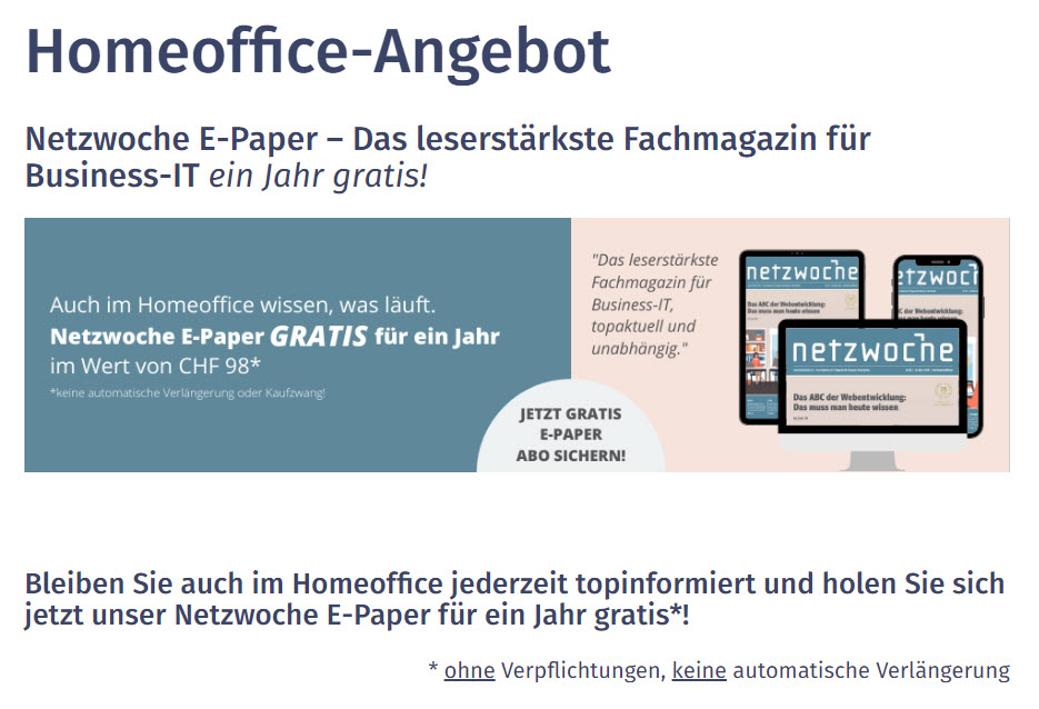Aufgrund der aktuellen Situation bietet die Netzwoche gratis ein Jahresabo ihres E-Papers an (keine automatische Verlängerung oder Kaufzwang). Einfach auf der Webseite registrieren und CHF 98.- sparen.