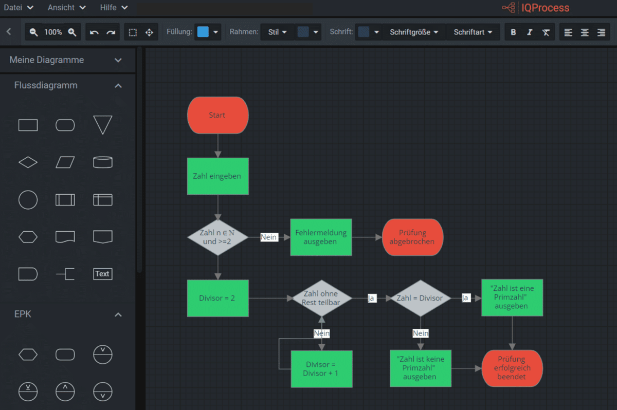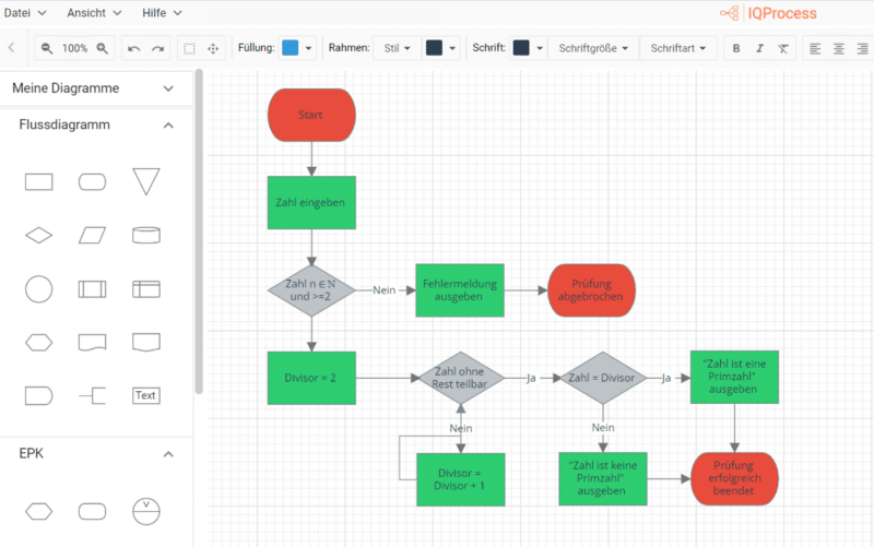 Für einfache Diagramme auch eine gute Option für einfache Diagramme, allerdings gibt es dort keinen Kollaborationsmodus, um in Echtzeit im gleichen Diagramm zu arbeiten. Da ist IQProcess schon einiges moderner und nutzerfreundlicher, ähnlich wie Visio oder vergleichbare kostenpflichtige Tools.