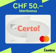Mit der Certo! One Mastercard World von Cembra bekommst du beim Bezahlen immer bis zu 1% Geld zurück! Und für den 1. Einkauf bekommst du 50 Franken geschenkt.