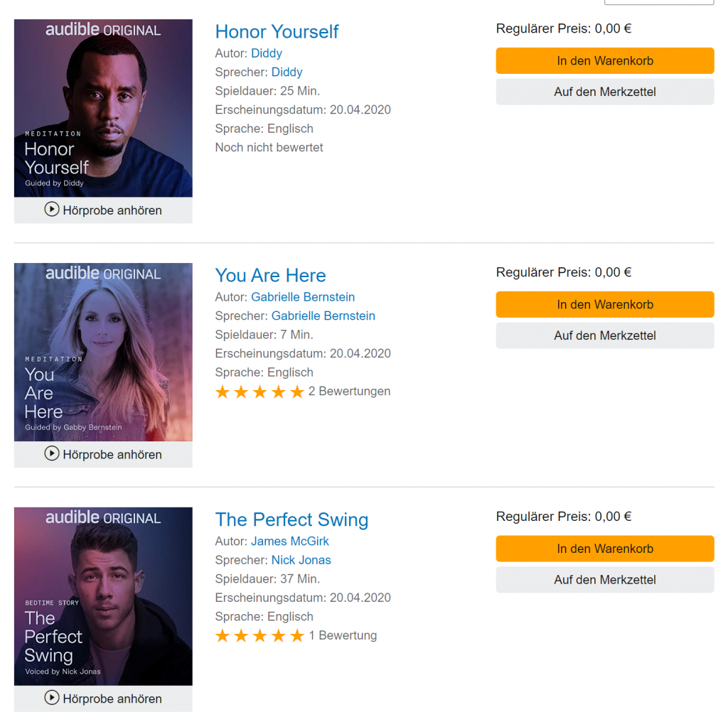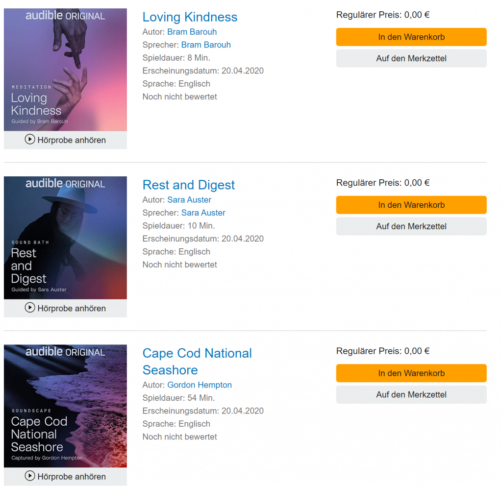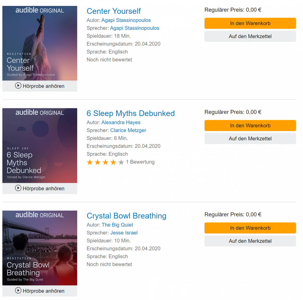 Bei Audible gibt’s gerade verschiedene Meditationshörbücher gratis bis am 21. Mai. Die Hörbücher sind allesamt in Englisch. Ein gratis Audible Konto ist für den Download erforderlich, die Hörbücher behält man anschliessend für immer.