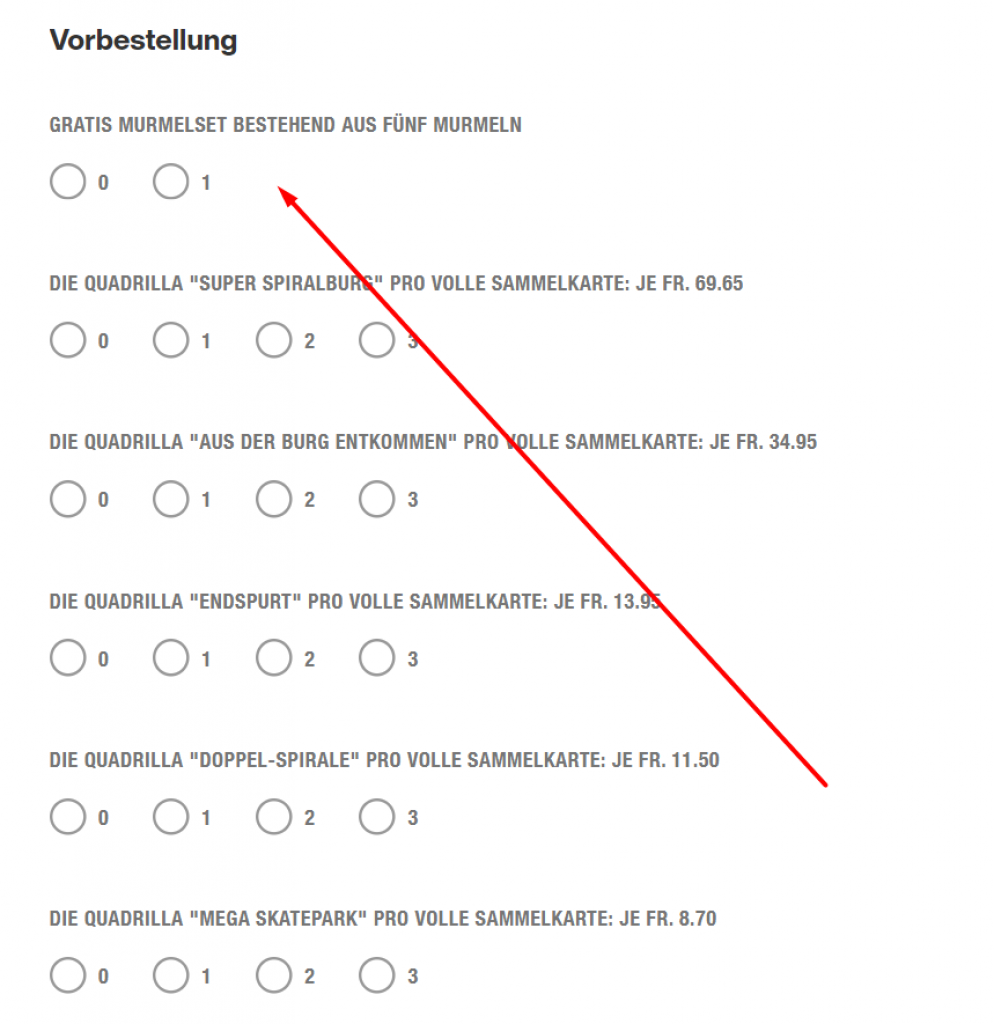Die entsprechenden Spezial-Murmel-Sets oder gleichwertige Ersatz- Murmeln werden von der Migros bestellt. Sobald die Murmel-Sets erhältlich sind (dies kann je nach Bestellmenge / Lieferzeiten mehrere Wochen oder Monate dauern) werden Sie auf die von Ihnen angegebene E-Mail-Adresse kontaktiert. Dort erhalten Sie dann weitere Infos zur Abholung und/oder Zustellung der Murmel-Sets.