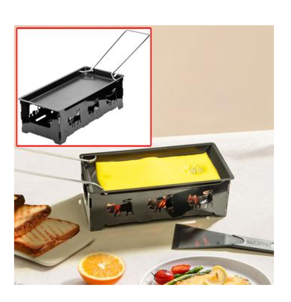 Funktionalität trifft Style: Das schwarz lackierte Metallgestell mit seinen ausgestanzten Kühen ist elegant und eignet sich auch wunderbar als kleines Geschenk. Das faltbare Raclette-Teelicht-Set ist stabil und dank der Antihaftbeschichtung lässt sich die Käsepfanne leicht reinigen. Nicht zuletzt der Klappgriff spart Platz und erhöht die Funktionalität.