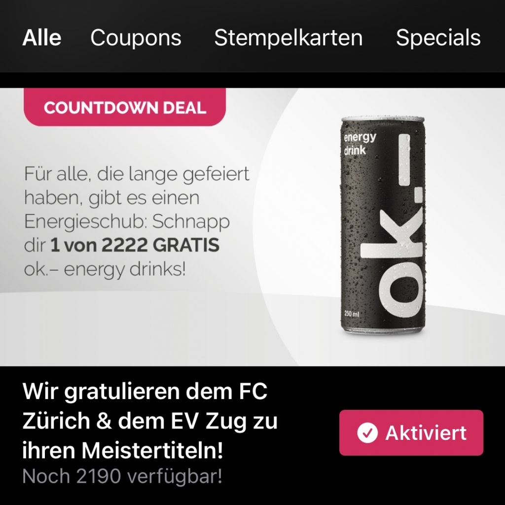 Valora gönnt wieder: je 1 von 2222 gratis ok.- Energy Drinks bei avec und k kiosk mit den jeweiligen Apps.