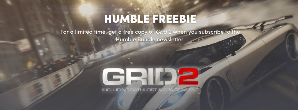 Wenn ihr den Humble-Bundle-Newsletter abonniert, erhält ihr einen kostenlosen Steam-Key um das PC-Spiel „Grid 2“ herunterzuladen. Das Angebot funktioniert übrigens auch, wenn man den Newsletter bereits abonniert hat. Weil das Spiel nicht mehr bei Toppreise gelistet ist, habe ich als Konkurrenzpreis den Preis bei Steam verwendet. Dort würde das Spiel normalerweise Fr. 29.- kosten.