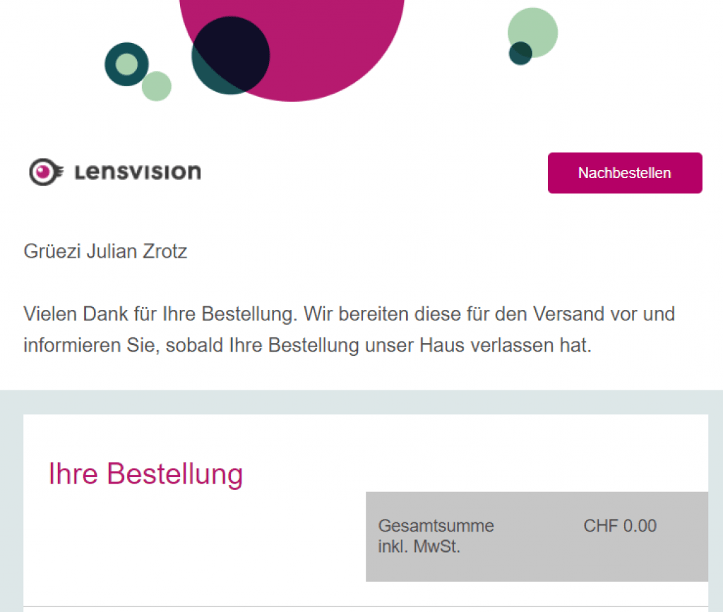 Die Anmeldung ging ziemlich fix. Zuerst E-Mail Adresse, anschliessend Kontaktdetails und danach die Linsendetails eingeben und schon ist man fertig. Ich empfehle, eine Zweitemail-Adresse zu verwenden. Just in case. Man erhält dann eine Bestellbestätigung per E-Mail die etwa so aussieht: