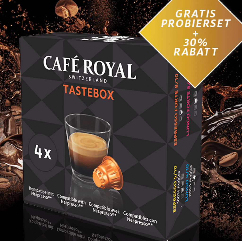 In diesem Probierset sind die Sorten Espresso, Espresso Forte, Lungo und Lungo Forte enthalten. Ausserdem bekommst du einen Gutschein mit 30% Rabatt auf Ihre erste Bestellung bei Café Royal, sollten dir die Kaffeesorten gefallen.