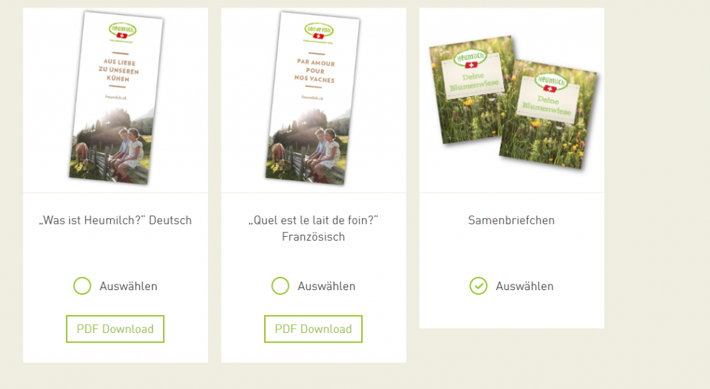 Bei Heumilch kann man sich gerade ein gratis Samenbriefchen mit dem Namen „Blumenwiese“ bestellen. Zudem auch Malvorlagen für Kinder.