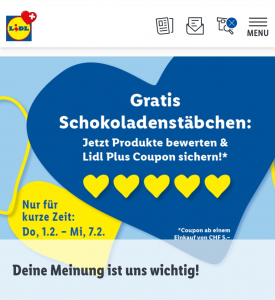 Vom 01. bis 07.2.2024 gibt es via der Lidl Plus App für Bestandes- und Neukunden einen Schokoladenstäbchen gratis (Coupon ab einem Einkauf von CHF 5.- einlösbar). Dafür einfach folgende Anweisung befolgen 🙂