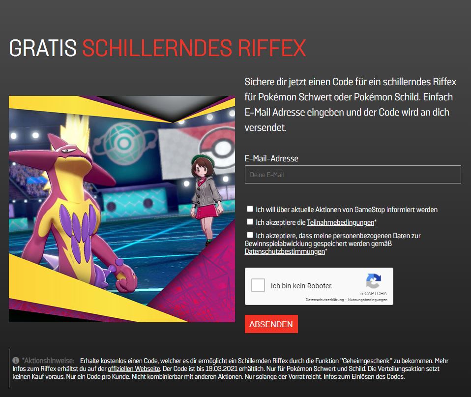 Derzeit gibt es bei Gamestop eine coole Aktion für alle Pokémon Fans unter euch, die gerade intensiv Pokémon Schwert und Schild spielen. Man kann sich nämlich ohne jegliche Kosten ein gratis schillerndes Riffex an seine E-Mail Adresse schicken lassen 😀 (Man bekommt dann einen Code, den man dann im Spiel Schwert & Schild unter der Option „Geheimgeschenk“ ohne Probleme einlösen kann).