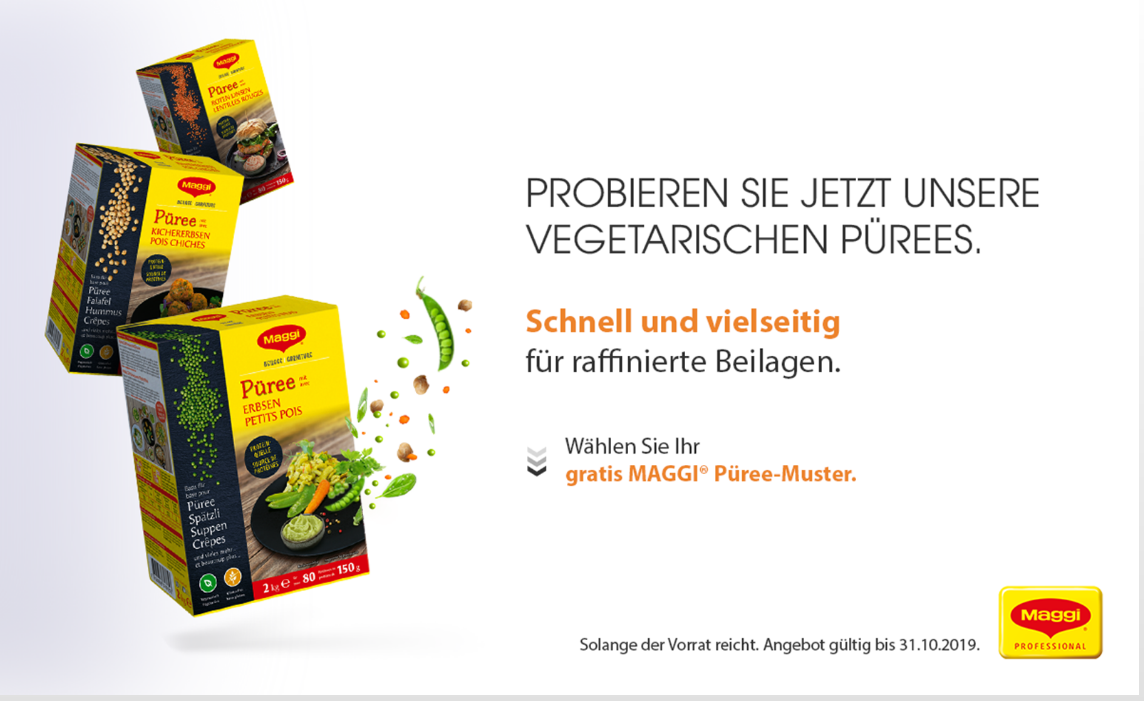 Bei Nestlé Professional bekommt man bis zum 31.10.2019 eine 2kg Packung Püree von Maggi. Man kann zwischen Erbsen, Kirchererbsen und rote Linsen wählen. Alle Produkte sind vegetarisch.
