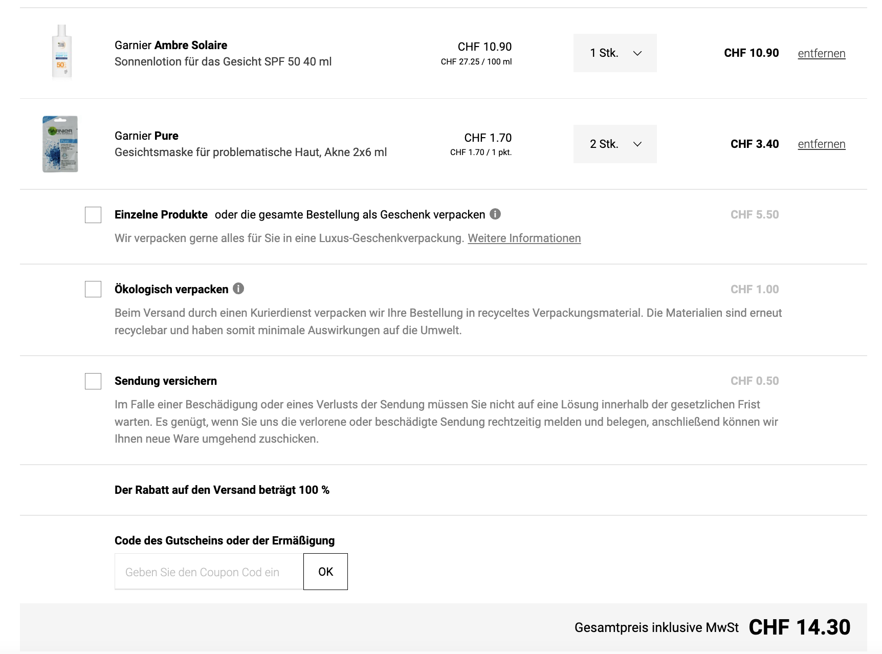 So erhält man zum Beispiel die Garnier Ambre Solaire Sonnencreme mit SPF 50 und zwei Garnier Gesichtsmasken für CHF 14.30. Alleine die Sonnencreme kostet bei anderen Händlern CHF 22.85 mit Versand.