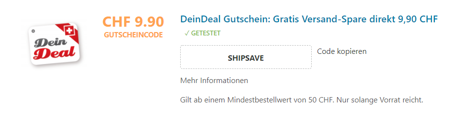 Bei DeinDeal gibts zurzeit mit dem Code SHIPSAVE die Versandkosten von bis zu CHF 9.90 gestrichen, sofern man einen Mindestbestellwert von 50 Franken erreicht. Danke an moni für den Hinweis!