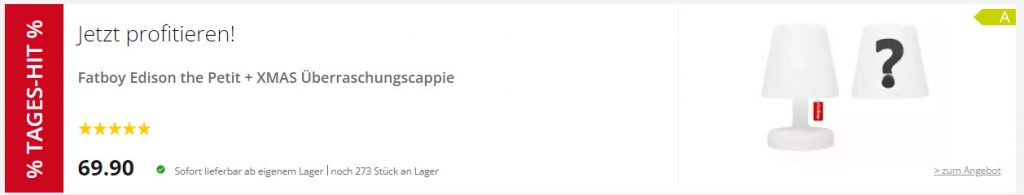 heutiges Tagesangebot bei Nettoshop ist eine Fatboy Lampe und dazu gibt es einen zusätzlichen Lampenschirm mit einem Weihnachtsmotiv dazu 🙂
