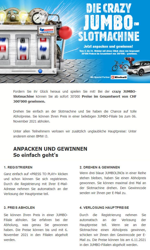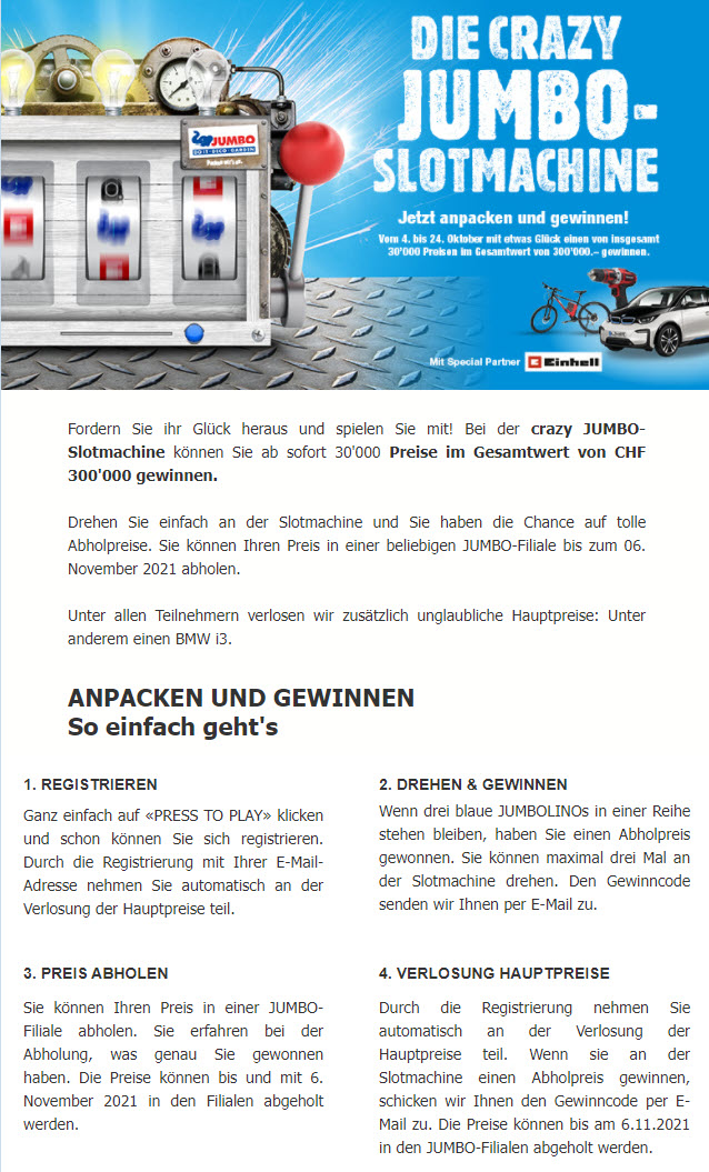 Bei Jumbo gibt es momentan wieder das Slotmaschine-Gewinnspiel, bei welchem es attraktive Preise zu gewinnen gibt. Das Gewinnspiel läuft noch bis zum 24.10.2021, die Preise müssen bis spätestens 6.11.2021 in einer Filiale abgeholt werden.