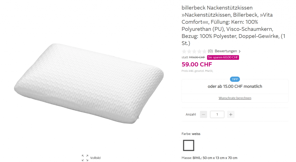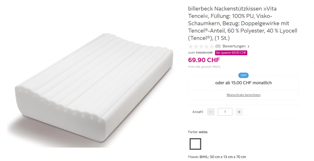 billerbeck Nackenstützkissen »Vita Memory«, Füllung: 100% PU, Visko-Schaumkern, Bezug: 60% Polyester, 40% Baumwolle, (1 St.) für CHF 41.93 (zweitbester Preis: CHF 45.09 jedoch „neuwertig und geprüft“ vs. wirklich neu bei Jelmoli)