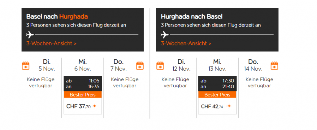 Derzeit gibt’s bei Easyjet günstige Flüge von Basel nach Ägypten (Marsa Alam und Hurghada). Der Reisezeitraum mit den günstigen Preisen ist von Oktober bis März. Reist man zu zweit, gibt’s den Hin- und Rückflug für gerade einmal 65 Franken. Reist man alleine, wird’s ca. 15 Franken teurer: