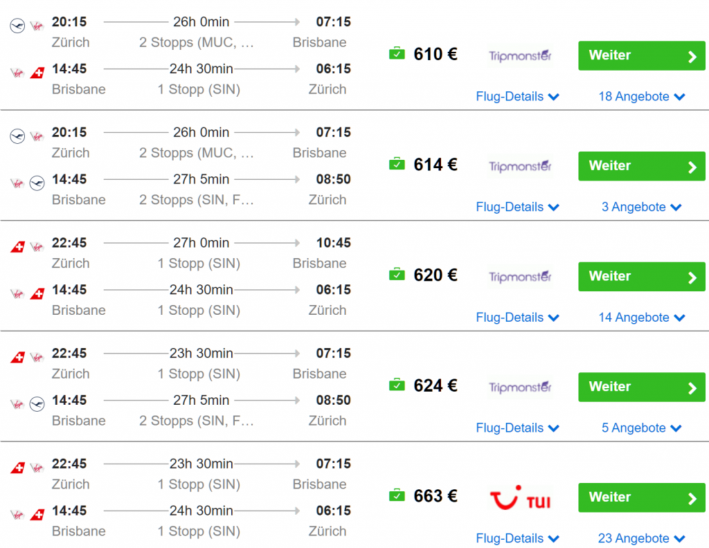 Die Star Alliance Partner Swiss, Lufthansa und Singapore Airlines bieten aktuell Tickets für Flüge nach Australien reduziert an. Mit Abflug von Zürich (teils auch Basel) kann man im Reisezeitraum Mai-Juni sowie August-November ab 610€ nach Perth, Brisbane, Sydney oder Adelaide fliegen. Aufgabegepäck ist inklusive.