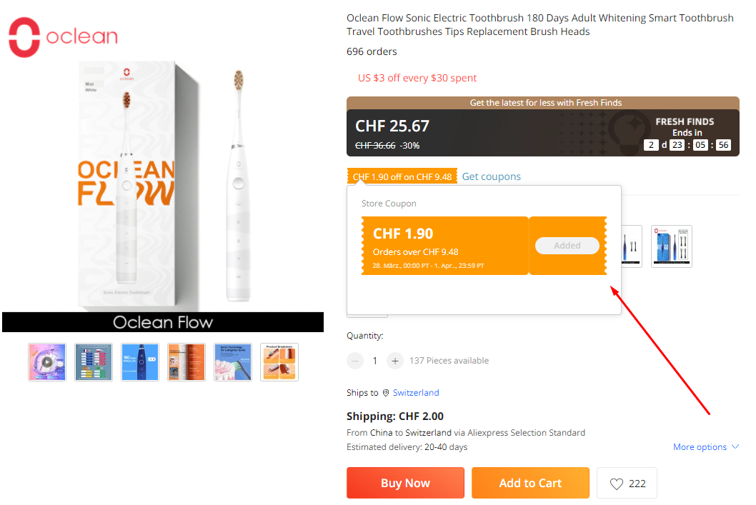Bei Aliexpress gibt’s derzeit die wohl günstigste Schallzahnbürste der Welt, die Oclean Flow zum Aktionspreis von knapp 26 Franken inkl. Lieferung! Um auf den Preis zu kommen, müsst ihr auf der Übersichtsseite den Store Coupon aktivieren (1.90 Franken Ersparnis):