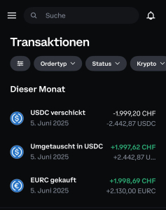 • Fügt eure virtuelle Revolut-Karte in Coinbase hinzu.• Kauft den Stablecoin EURC (Euro Coin) – das ist ein 1:1 Euro-gebundener Coin von Coinbase (wie USDC, nur in EUR, wichtig weil coinbase alles andere als der Interbankenkurs verwendet).• Dieser Kauf ist komplett gebührenfrei.• Danach: EURC in USDC tauschen – ebenfalls ohne Gebühren.• Der Vorteil: USDC ist weltweit handelbar auf fast allen Börsen und Wallets.