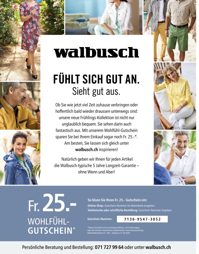 Bei Walbusch.ch erhält man ab 100.- Einkauf 25.- geschenkt. Gutschein gültig bis 31.05.20, so kann man sich einige Franken sparen