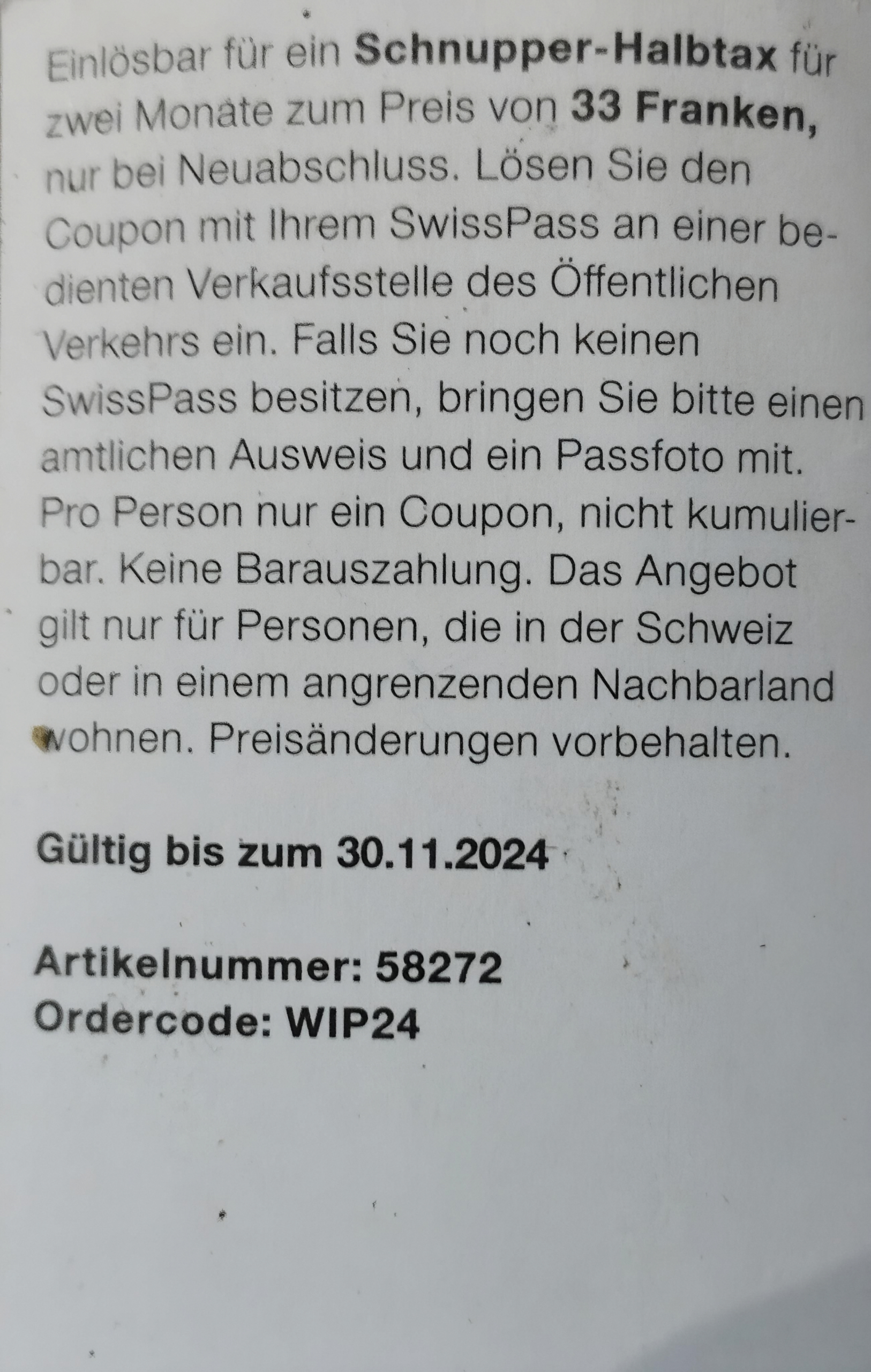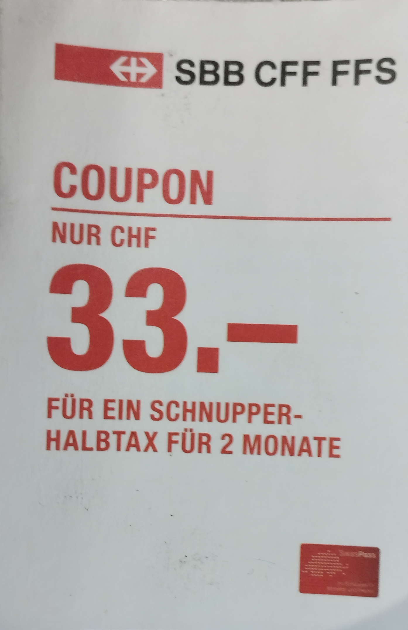 Einlösbar für ein Schnupper-Halbtax für zwei Monate zum Preis von 33 Franken, nur bei Neuabschluss. Lösen Sie den Coupon mit Ihrem SwissPass an einer bedienten Verkaufsstelle des Öffentlichen Verkehrs ein. Falls Sie noch keinen SwissPass besitzen, bringen Sie bitte einen amtlichen Ausweis und ein Passfoto mit. Pro Person nur ein Coupon, nicht kumulierbar. Keine Barauszahlung. Das Angebot gilt nur für Personen, die in der Schweiz oder in einem angrenzenden Nachbarland wohnen. Preisänderungen vorbehalten.