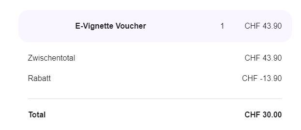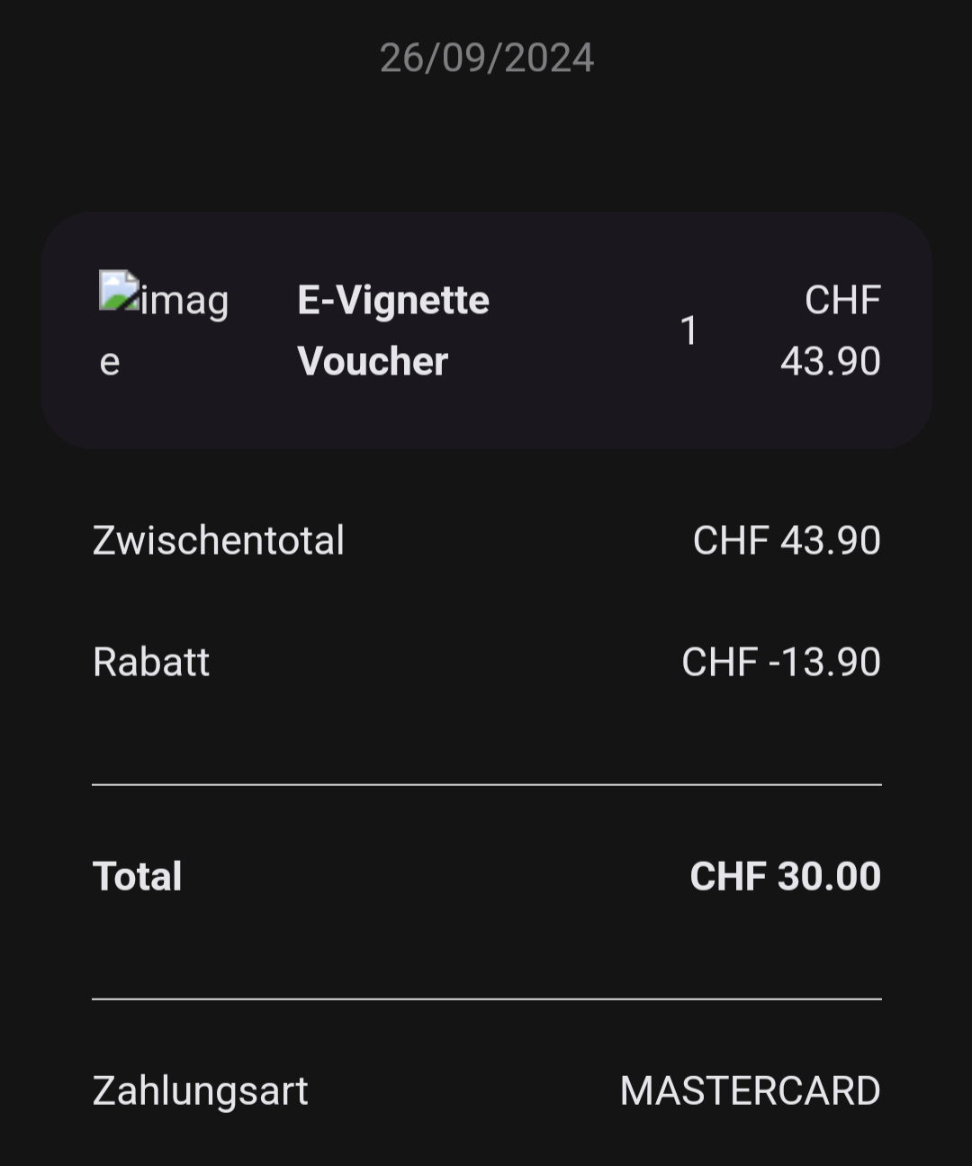 Über superbenefits.ch kann man aktuell die E-Vignette für 30 Franken holen. Dazu einfach für das gratis Konto registrieren und unter diesem Link die E-Vignette holen. Aktuell gibt’s 13.90 Franken Rabatt, was wohl nicht beabsichtigt ist für gratis Accounts. Daher schnell zuschlagen 😉