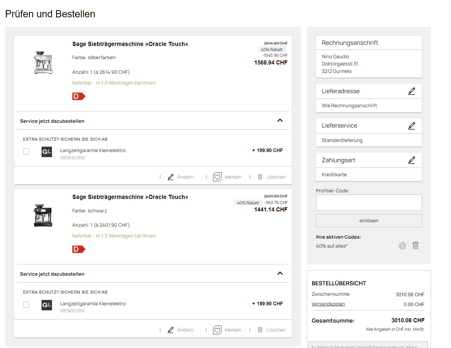Bei Jelmoli Shop scheint der neue 40% Rabattgutschein auch auf bestimmte Technikartikel zu klappen. So gibt’s die Sage Barista Pro Siebträgermaschine für 382.74 Franken. Aktuell kostet sie sonst 520 Franken. Nicht vergessen, bei Jelmoli Shop hat man 3 Jahre Garantie!
