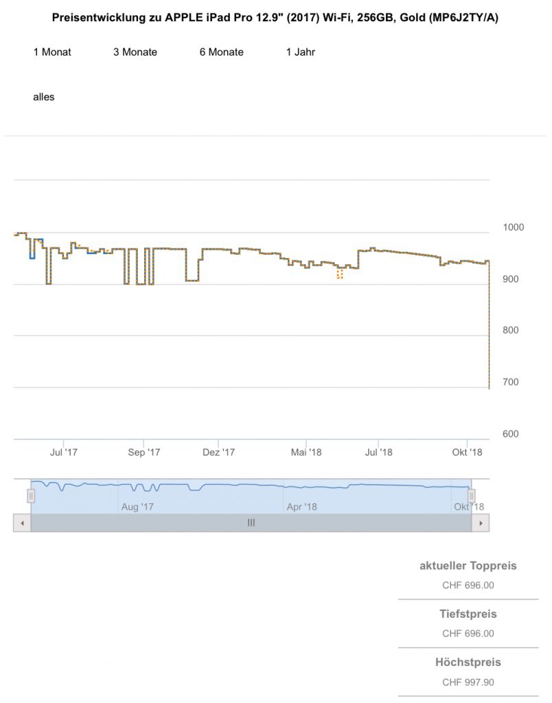 Gemäss toppreise gab es das iPad bislang nie günstiger als für 899.- CHF, der zweitbeste Preis liegt aktuell bei 944.- CHF.