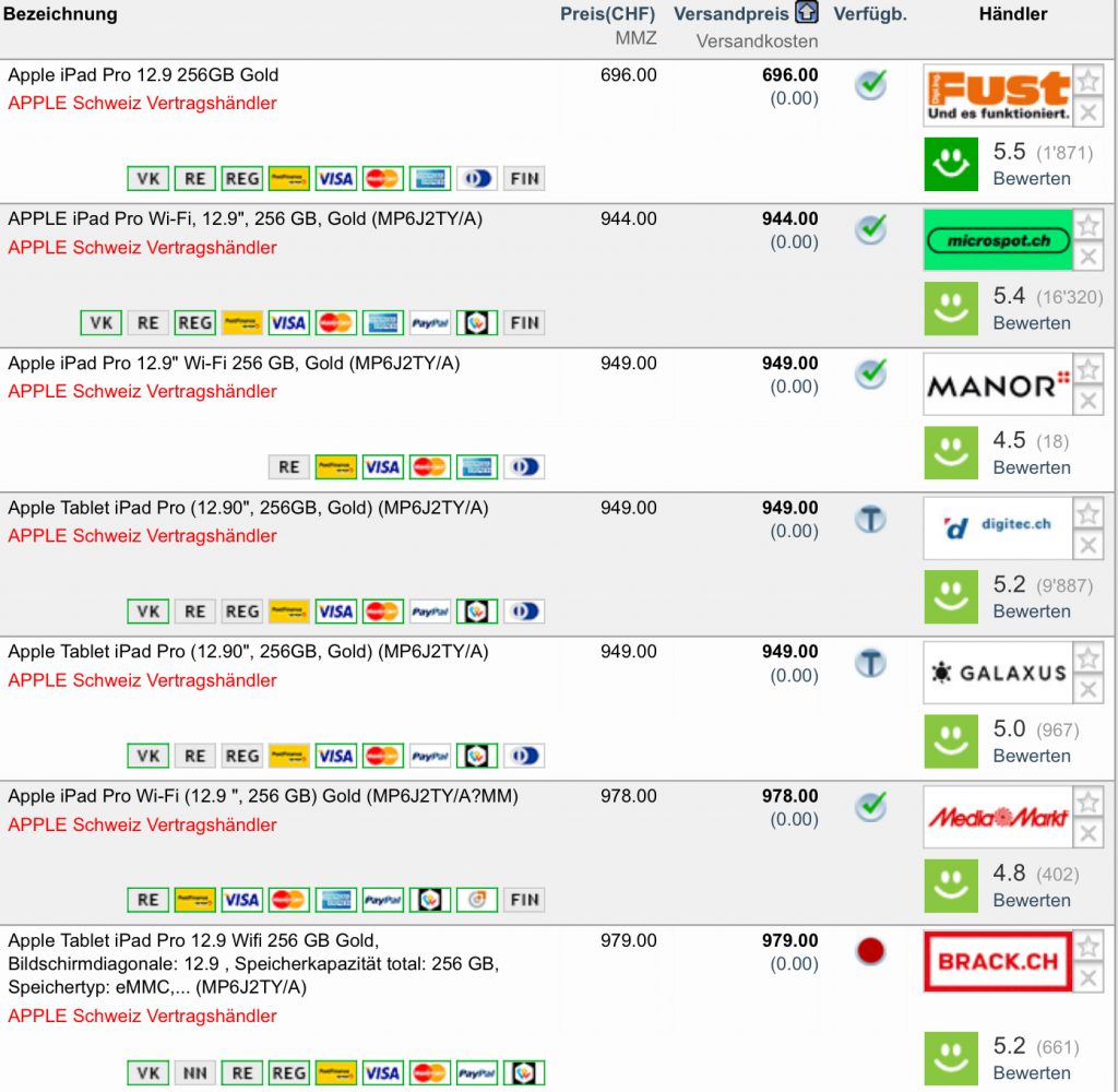 Bei Fust gibt es gerade das APPLE iPad Pro 12.9″ (2017) Wi-Fi mit 256GB in der Farbe Gold für 696.- CHF.