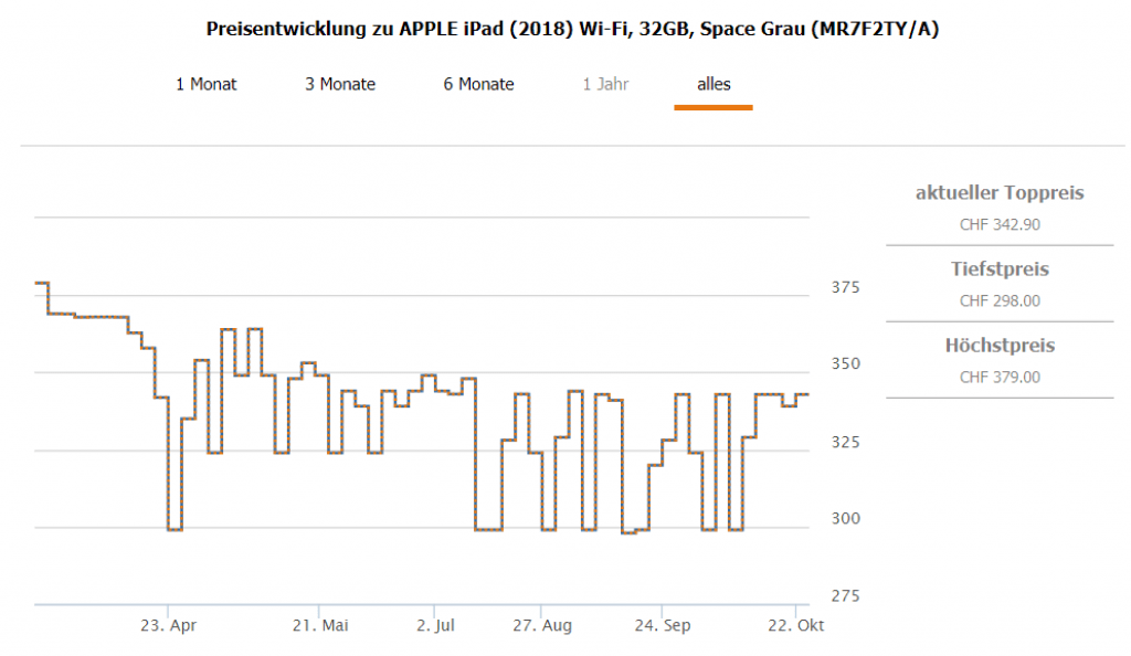 Zweitbester Preis momentan in der Schweiz: CHF 342.90, unter CHF 298.- erhielt man das Tablet noch nie.