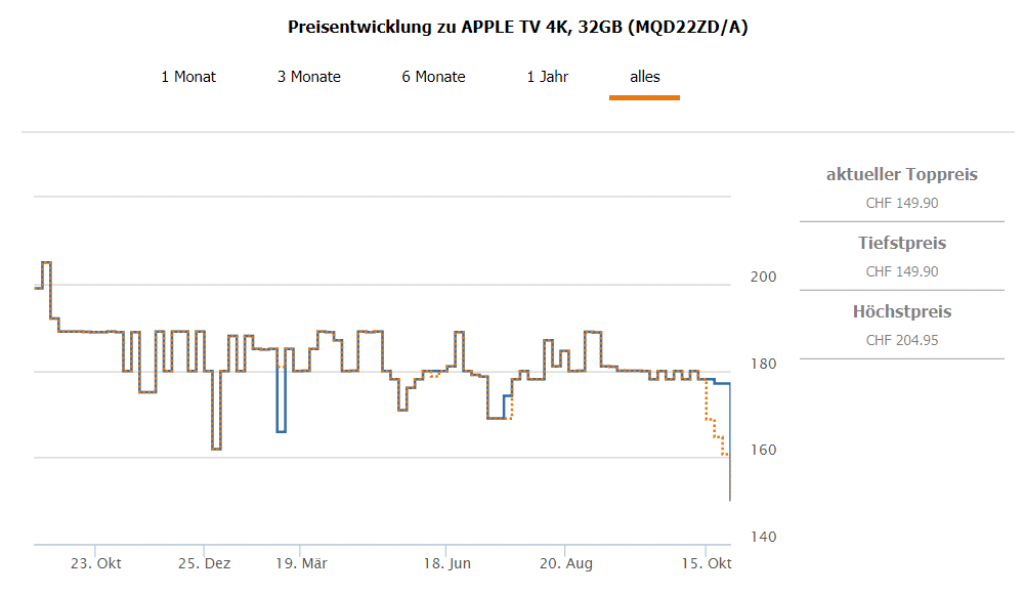 Beim heutigen Tagesdeal von Interdiscount gibt es das Apple TV 4K 32GB Black für CHF 139.90 wenn man den Gutscheincode HFWID10 beim Checkout eingibt. Laut Toppreise ist das auch der günstigste Preis bisher.