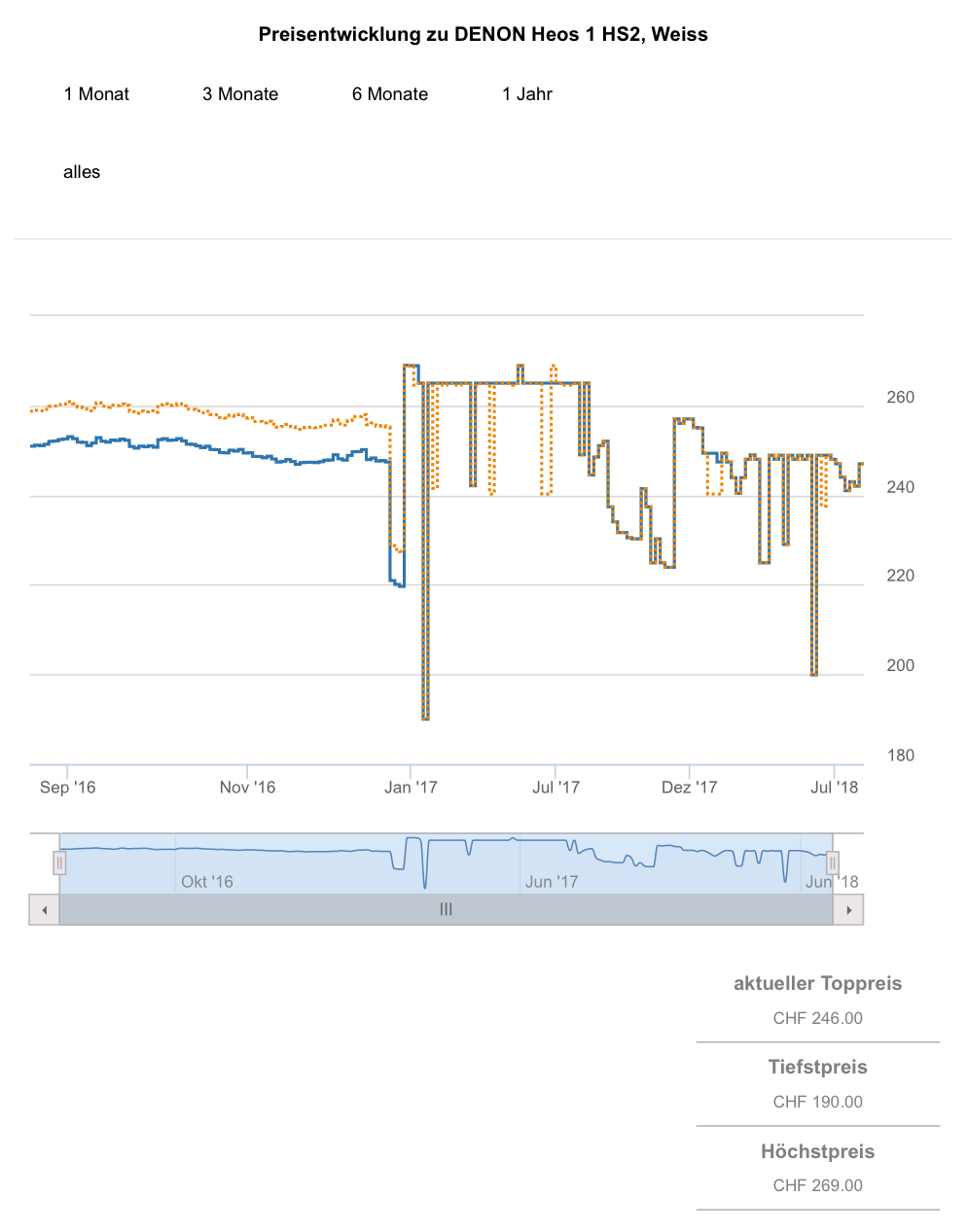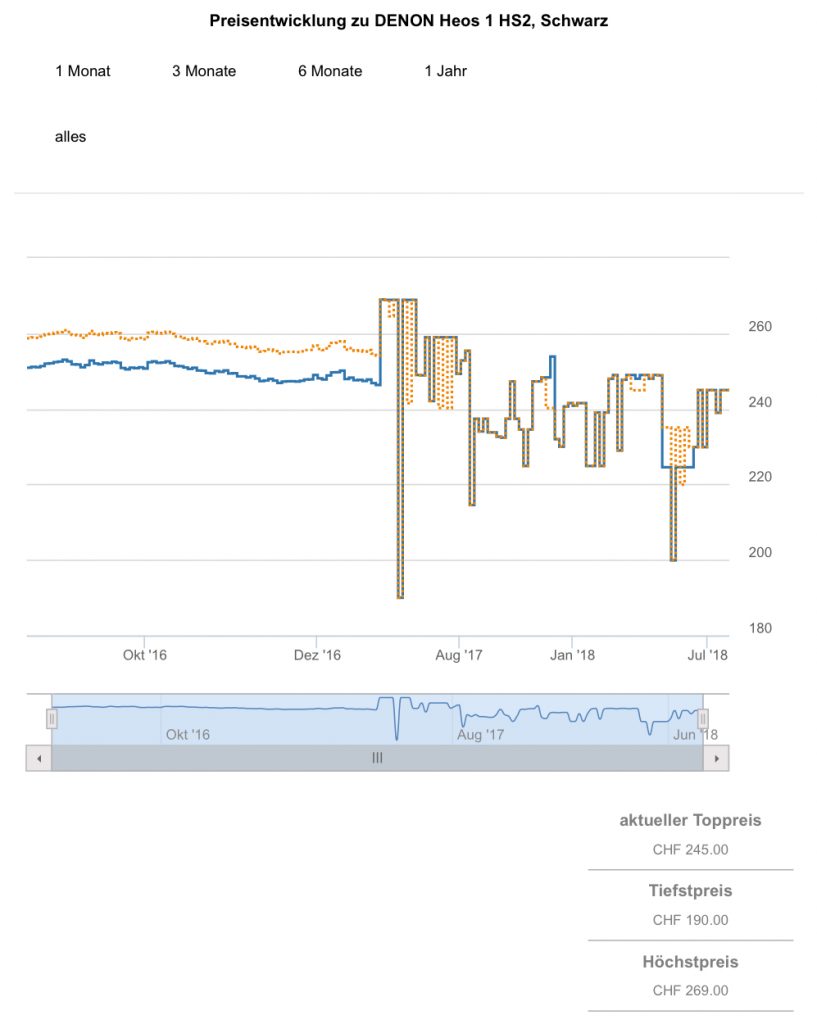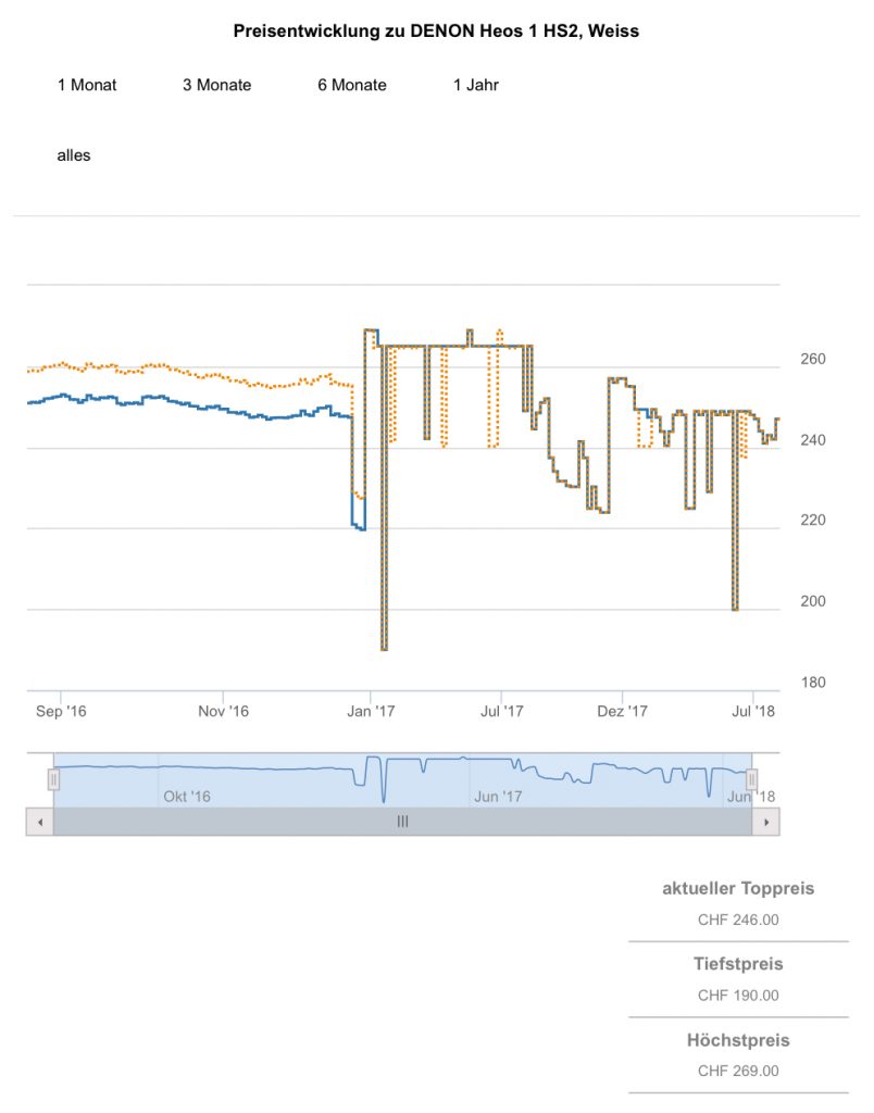 Die Heos 1 HS2 Lautsprecher kosten einzeln aktuell beim günstigsten Anbieter 245.- CHF bzw. 246.- CHF. Schwarz als auch Weiss gab es gemäss toppreise noch nie günstiger als für 190.- CHF (als Bundle gab es sie mal für 249.- CHF).