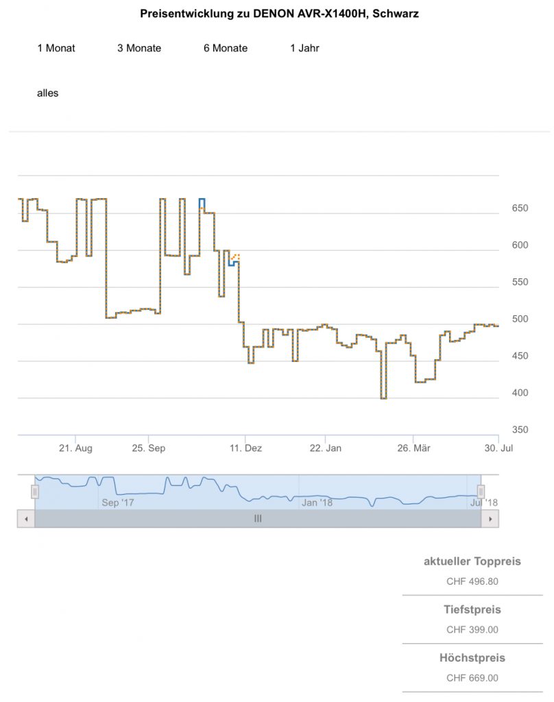 Den Receiver AVR-X1400H gibt es aktuell beim günstigsten Anbieter für 496.80 CHF, best price liegt bei 399.- CHF.