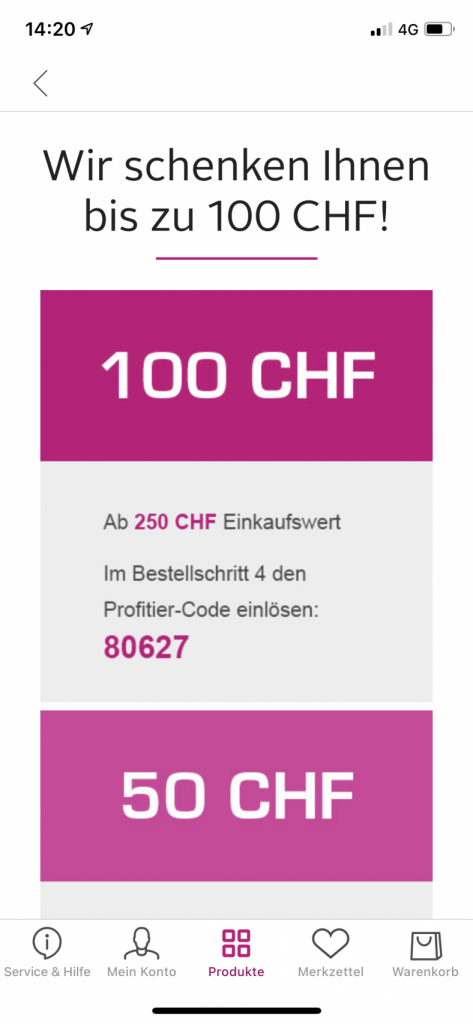 • CHF 100.- Rabatt ab CHF 250.- Einkauf (40%) mit Code „80627