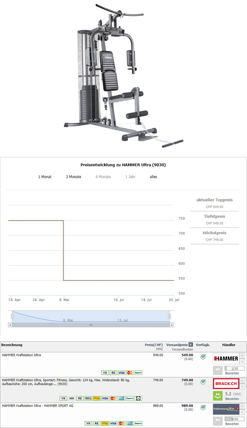 Bei Hammer gibt es momentan die HAMMER Kraftstation Ultra zum Bestpreis von CHF 549.-. Zudem scheint Hammer momentan einen Sales zu haben und es gibt diverse andere Fitnessgeräte mit Rabatten…einfach mal vorbeischauen im Webshop 😉