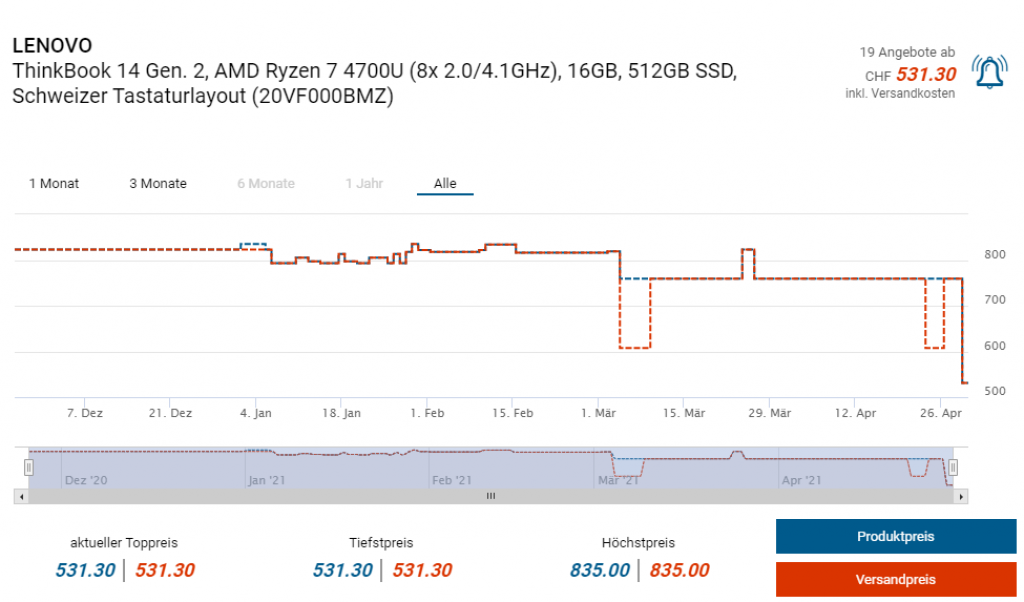 Im Lenovo Store gibts derzeit wieder einmal ein Hammer-Angebot. So kriegt ihr den Laptop Lenovo ThinkBook der 2. Generation mit AMD Ryzen 7 4700U Prozessor und 16GB Arbeitsspeicher zum Preis von gerade einmal CHF 531.30. Schon den Prozessor gibts äusserst selten für unter 600 Franken (wenn überhaupt), noch dazu sind hier 16GB RAM verarbeitet, die selbst bei 700 Franken teuren Laptops selten auffindbar sind!