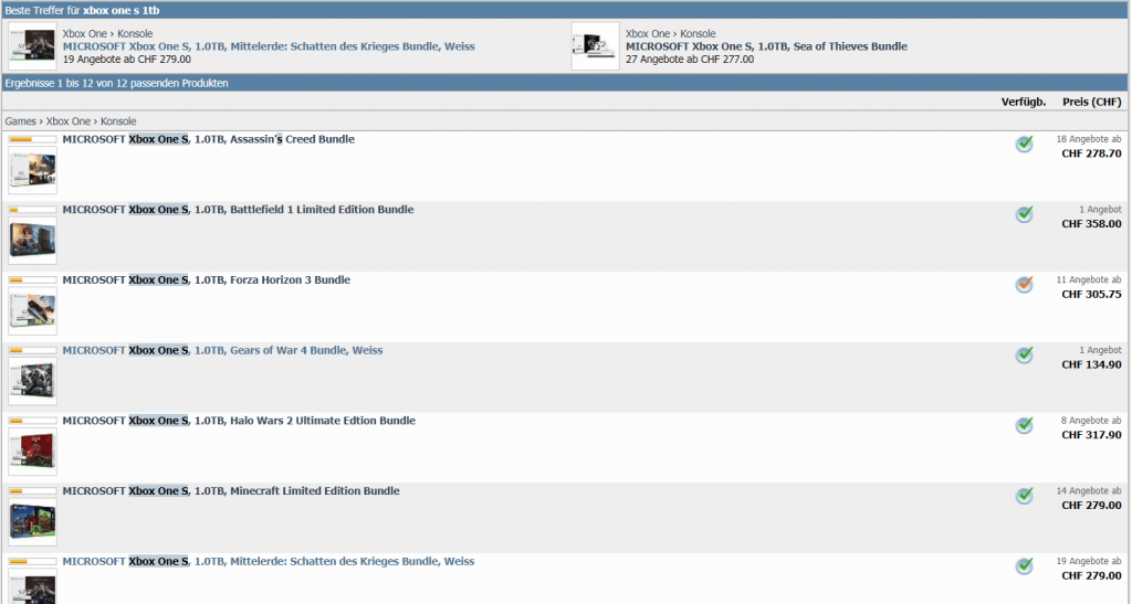 Vielleicht handelt es sich dabei um einen Preisfehler. Unter CHF 200.- habe ich noch nie ein Xbox One S 1TB Bundle gesehen. Wirklich ein sehr attraktiver Preis. Nicht einmal die Xbox alleine (500GB oder 1TB) gab’s jemals zu diesem attraktiven Preis. Momentan kosten die Bundles mit der 1TB Konsole um die CHF 277.-