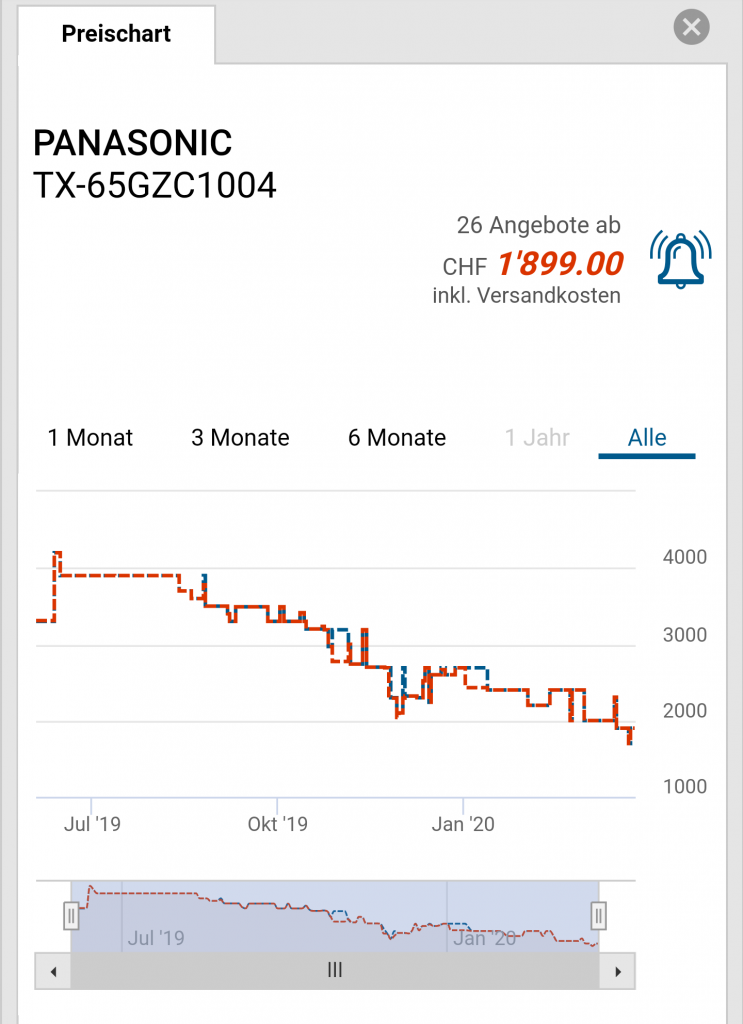 Bei qoqa gibts ab Mitternacht den Panasonic 65GZC1004 zum neuen Spitzenpreis. Lag dieser noch vor wenigen Tagen bei CHF 1699.-, so ist er bei qoqa für lediglich CHF 1299.- zu haben. Soweit ich weiss, gabs bisher noch nie einen 65 Zöller OLED-Fernseher von Panasonic zu solch einem niedrigen Preis.
