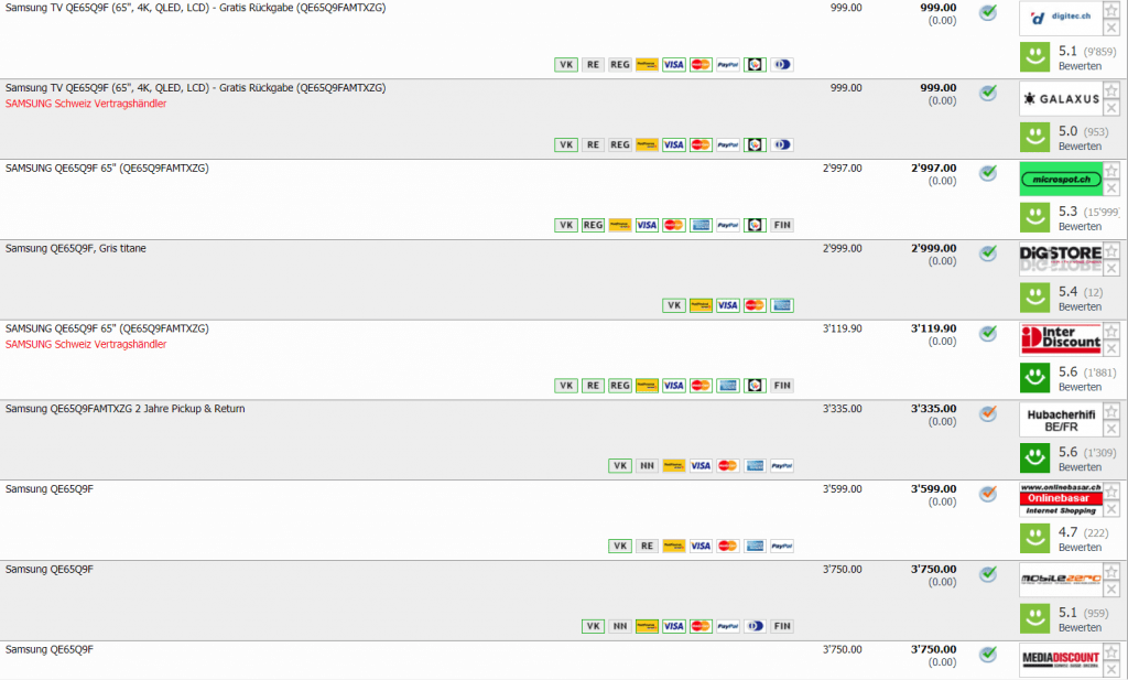 Wenn das nicht mal ein Hammer-Deal ist! Den Samsung QE65Q9F 65“ UHD TV gibts bei digitec zum Hammerpreis von gerade einmal 999 CHF, mit Geld-Zurück-Garantie! Zweithöchster Preis wäre schon bei 2997 CHF! Den QLED TV gab’s noch nie günstiger als CHF 2’800.