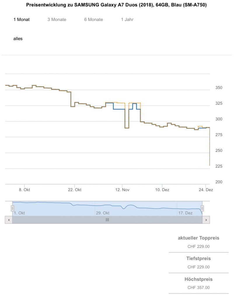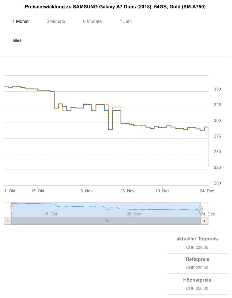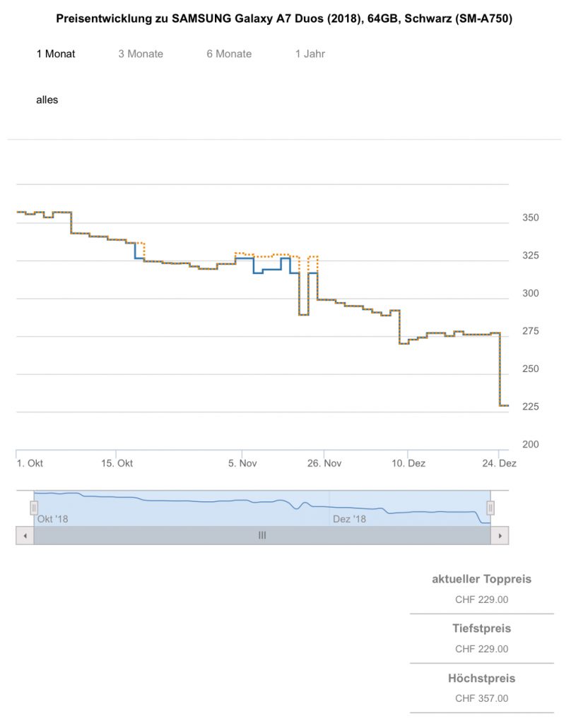 Bei interdiscount gibt es aktuell das SAMSUNG Galaxy A7 Duos (2018) für 229.- CHF.
