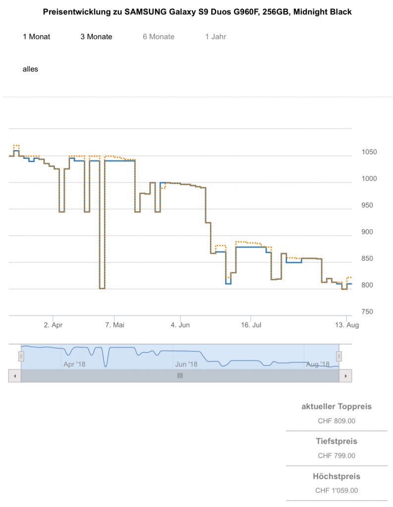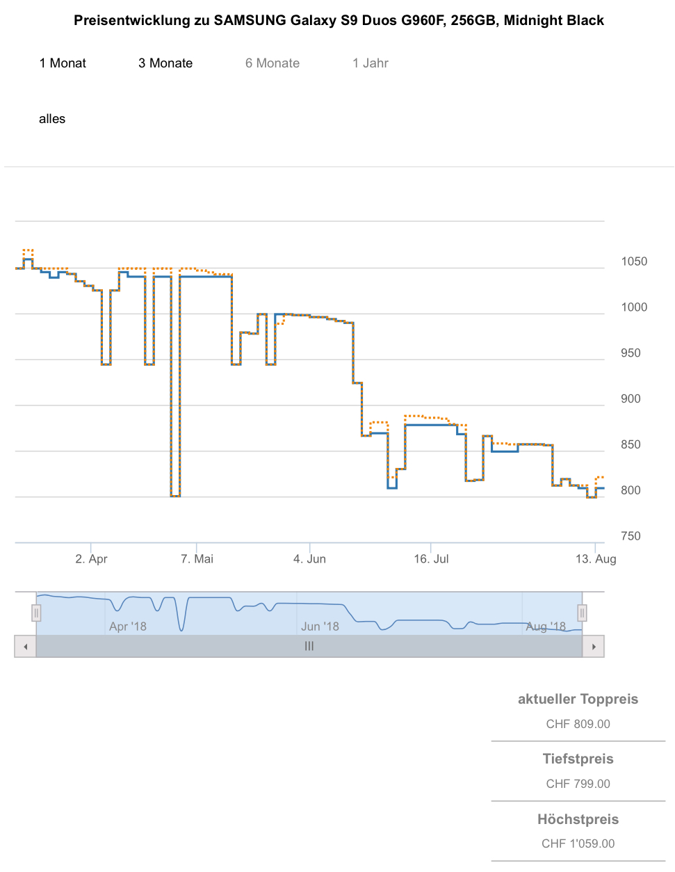 In der Farbe Sunrise Gold hatten wir das S9 Duo nach Gutscheinabzug mit 256GB einmal für 779.- CHF, ansonsten war es bislang über alle Farben nie günstiger als für 799.- CHF zu bekommen.